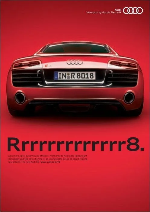 In der Kommunikation selbst taucht er meist weniger prominent auf – als eine Art Abbinder der aktuellen Kommunikationsbotschaft. Er bereitet dieser gewissermaßen die Bühne, auf der sie sich entfalten kann. Das Beispiel der R8-Anzeige von Audi zeigt das sehr schön.